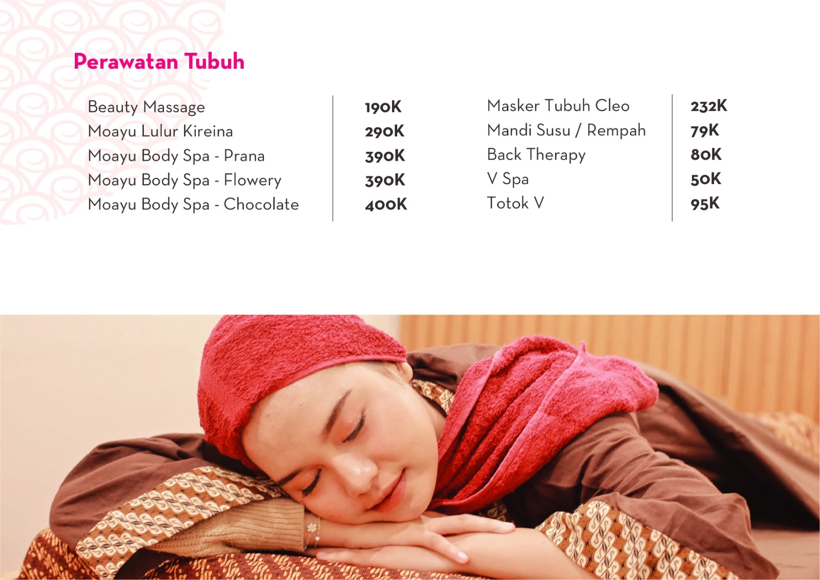 Dapatkan tubuh yang bersih, lembab, segar, halus, dan bercahaya dalam 1 x perawatan. Dengan Body Spa, jawaban dari semua kebutuhan tubuhmu.